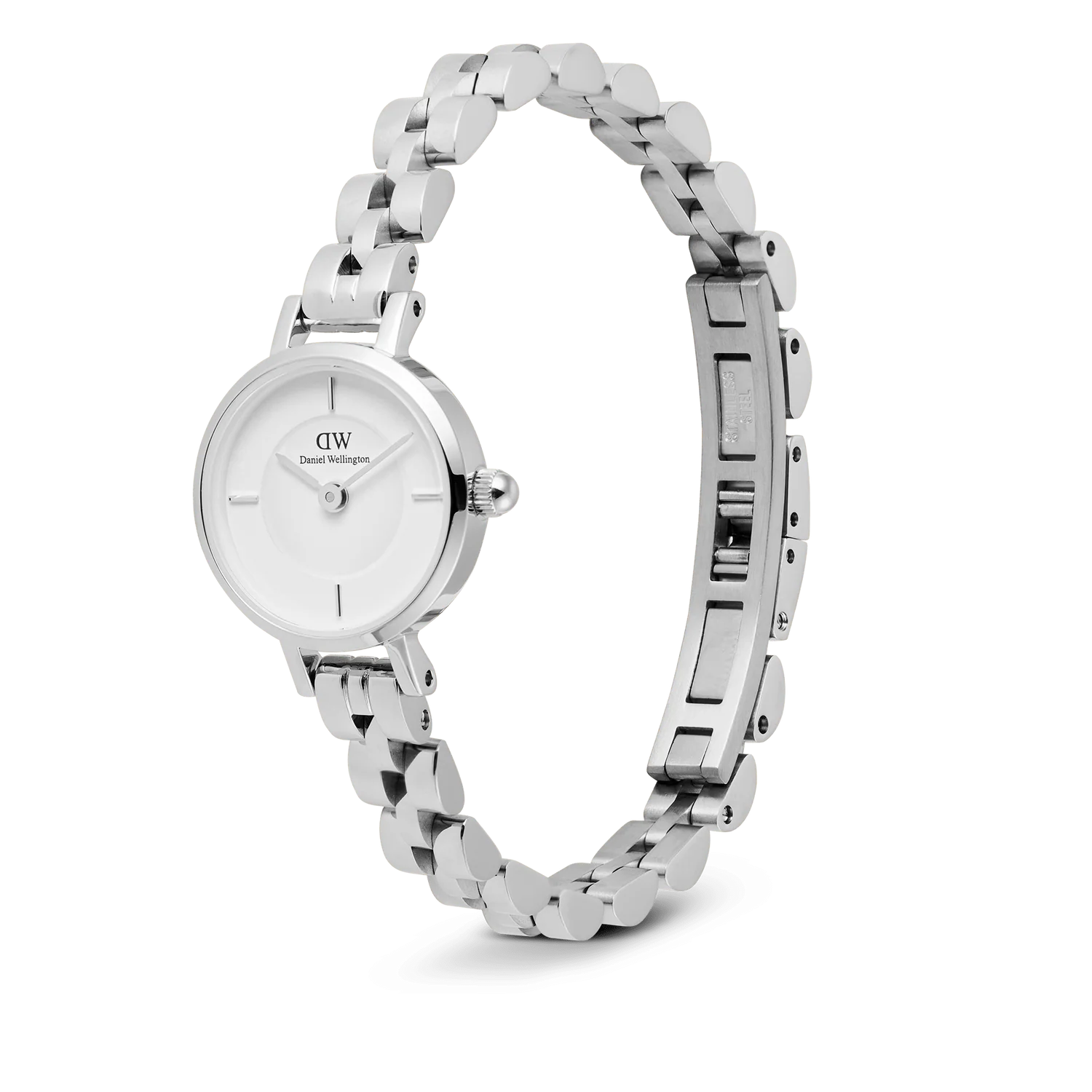 Il Petite Mini viene ridefinito con il nuovo bracciale Arch 3-Link, caratterizzato da un esclusivo design ad arco che si integra perfettamente con la sua estetica elegante e minimalista. Disponibile in argento, oro rosato e oro, questo bracciale è abbinato a un classico quadrante bianco, impreziosito da indici rettangolari lucidi a ore 3, 6, 9 e 12. La fibbia a farfalla senza pulsanti garantisce un look impeccabile e sofisticato, esaltando il design complessivo dell'orologio. Con i suoi dettagli raffinati e le proporzioni eleganti, il Petite Mini resta un accessorio senza tempo con un tocco di modernità.